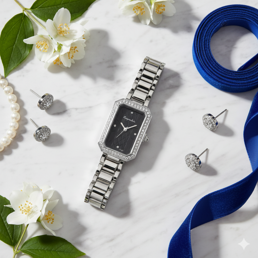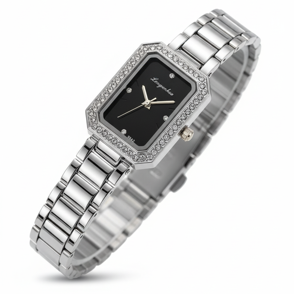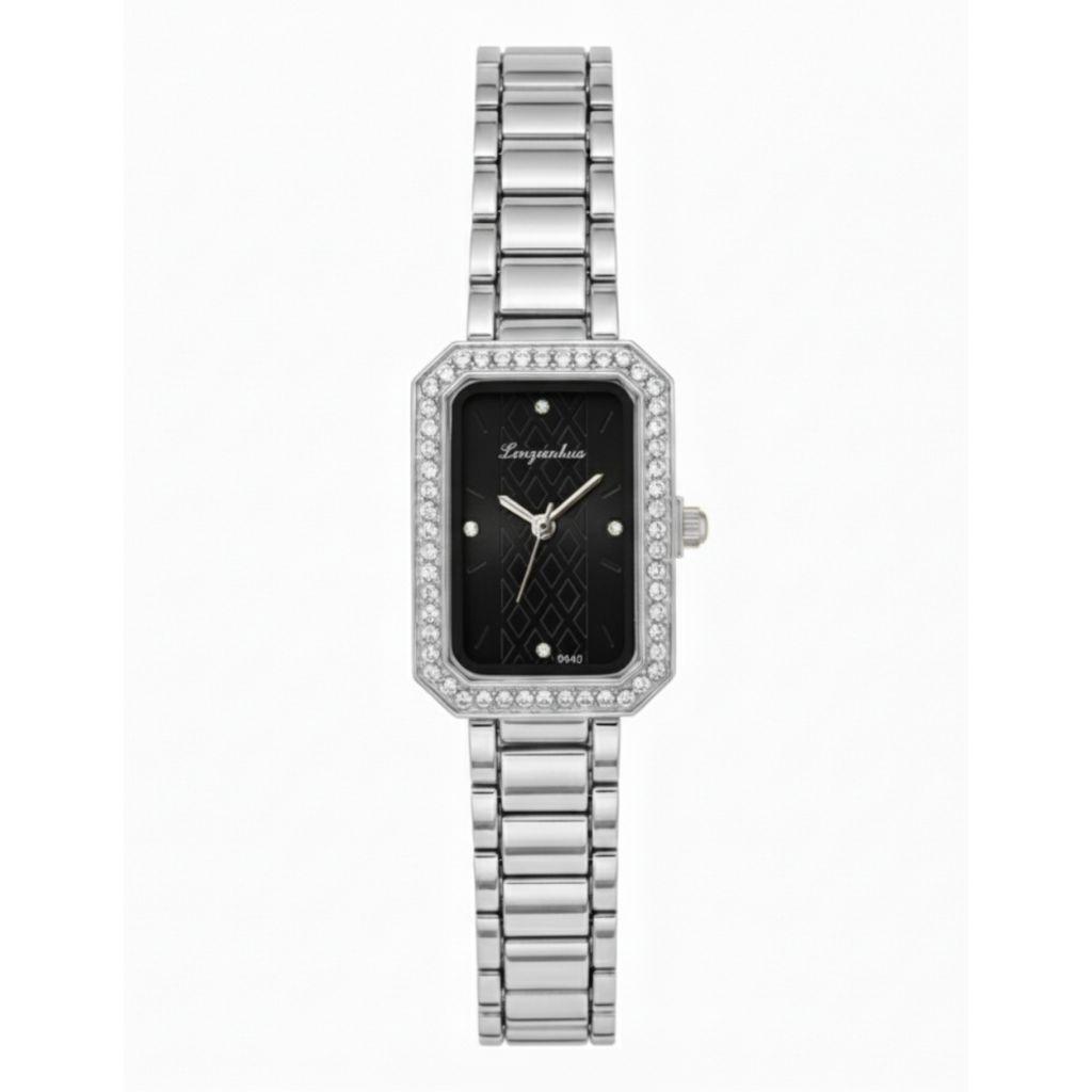 Γυναικείο Vintage ρολόι με ασημί μπρασελέ από ανοξείδωτο ατσάλι και μαύρο καντράν με στρας.