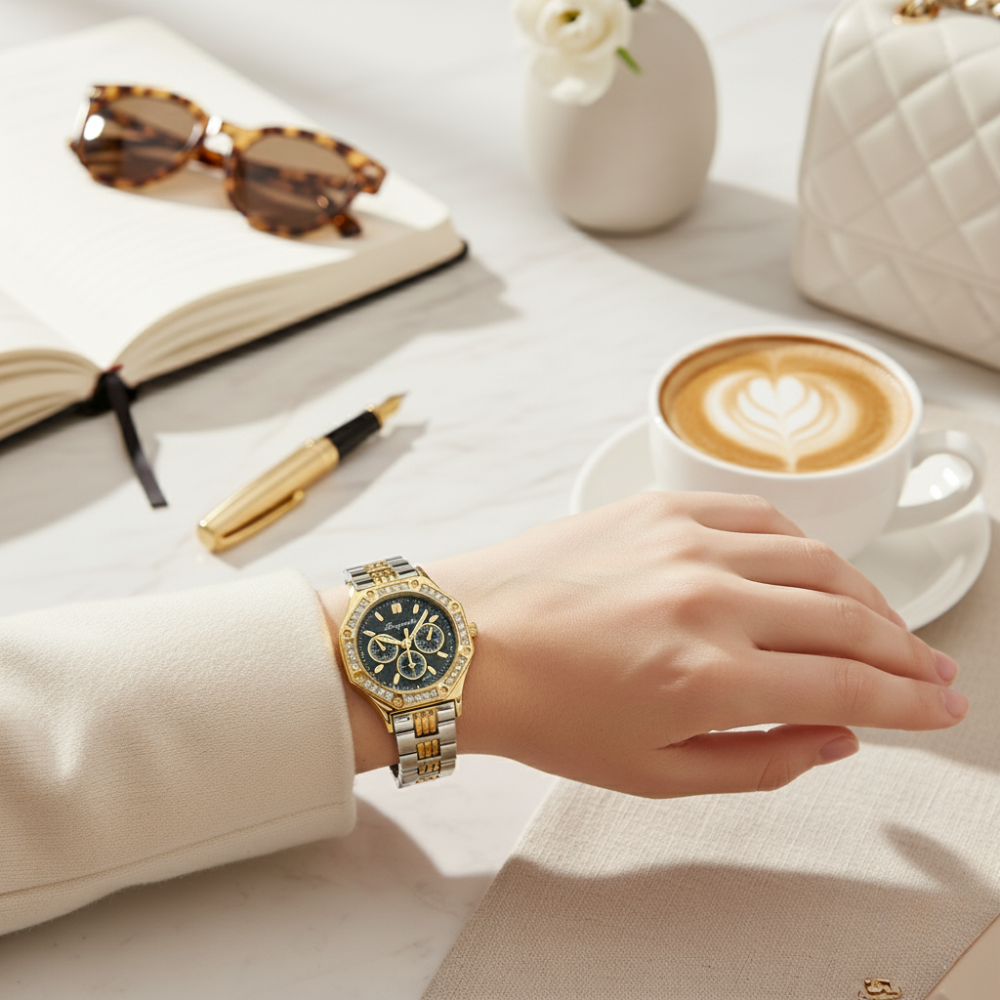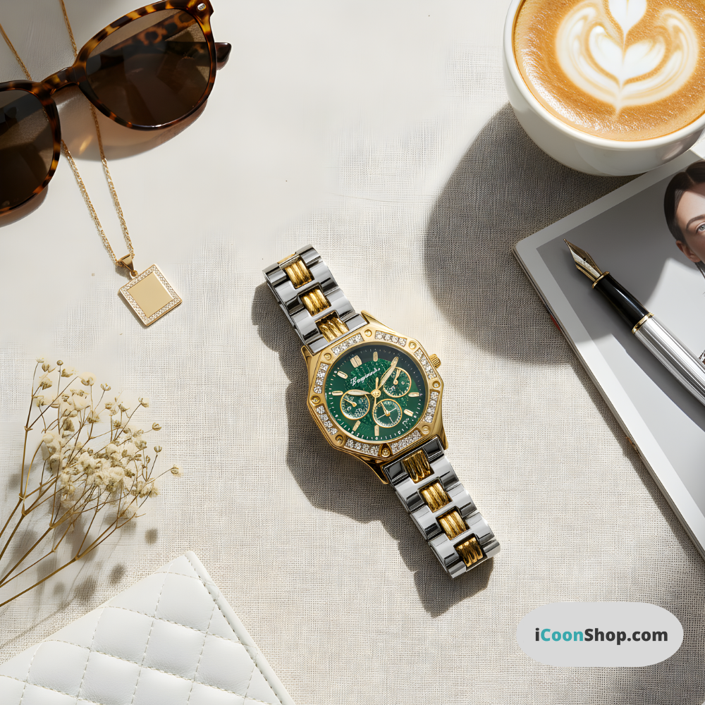 Ανακαλύψτε το Vintage Γυναικείο Ρολόι Gold Silver Green, με χρυσό ασημί μπρασελέ και πράσινο καντράν — η επιτομή της εκλεπτυσμένης κομψότητας από το iCoonShop.com. Αδιάβροχο (3ATM) και διακοσμημένο με λαμπερά στρας, προσδίδει λάμψη και γοητεία σε κάθε σας στιγμή.