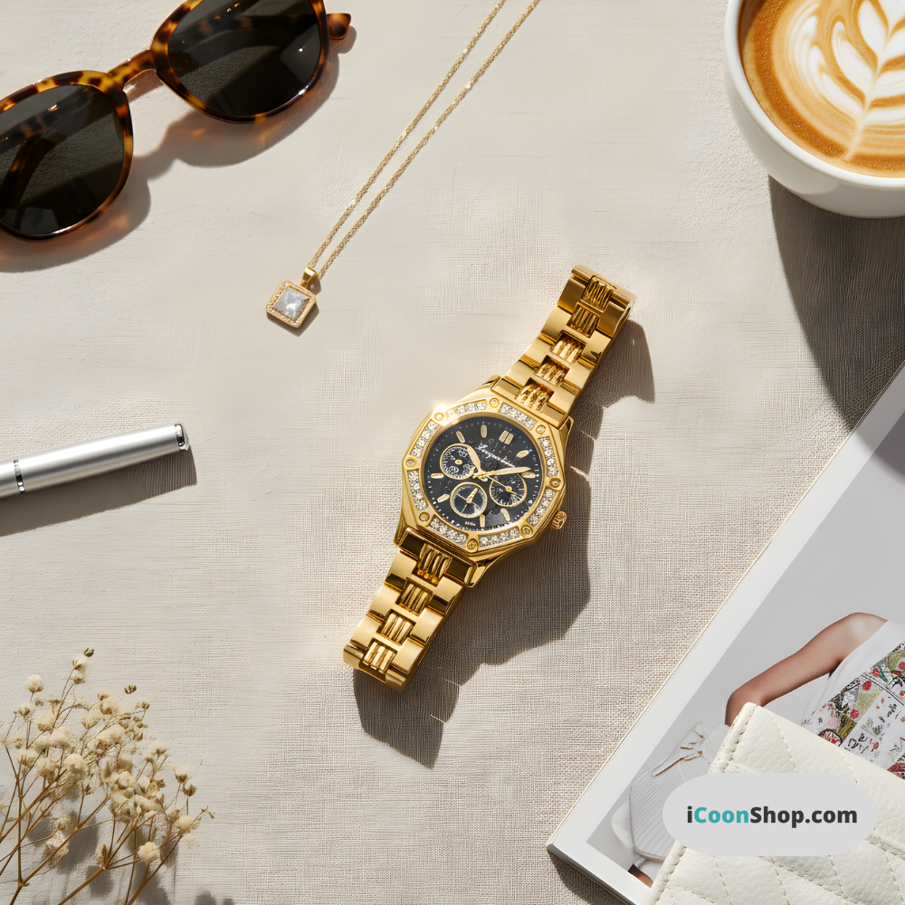 Ανακαλύψτε το Vintage Γυναικείο Ρολόι Sofia Gold Black — την επιτομή της εκλεπτυσμένης κομψότητας από το iCoonShop.com. Αδιάβροχο (3ATM) και διακοσμημένο με λαμπερά στρας, προσδίδει λάμψη και γοητεία σε κάθε σας στιγμή.