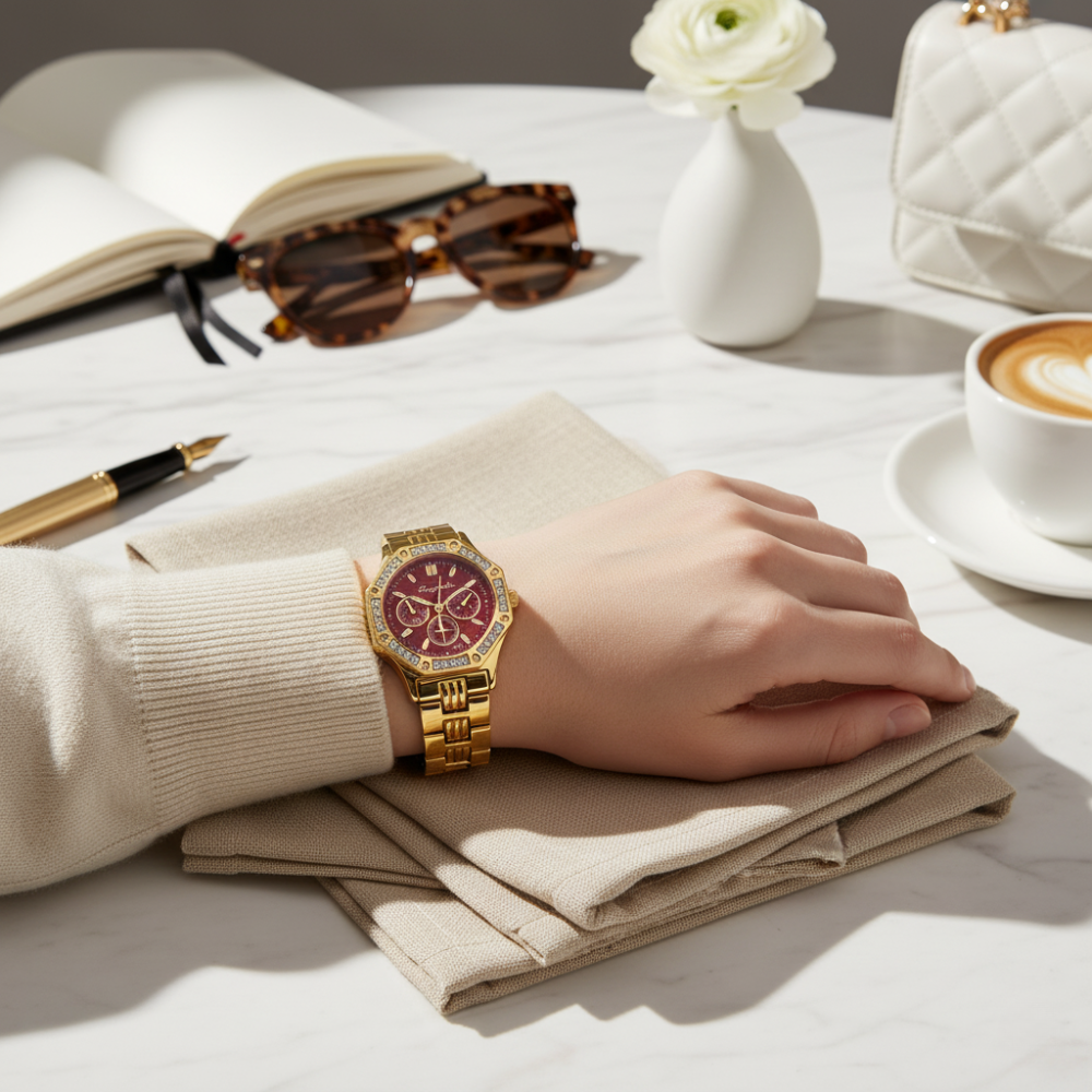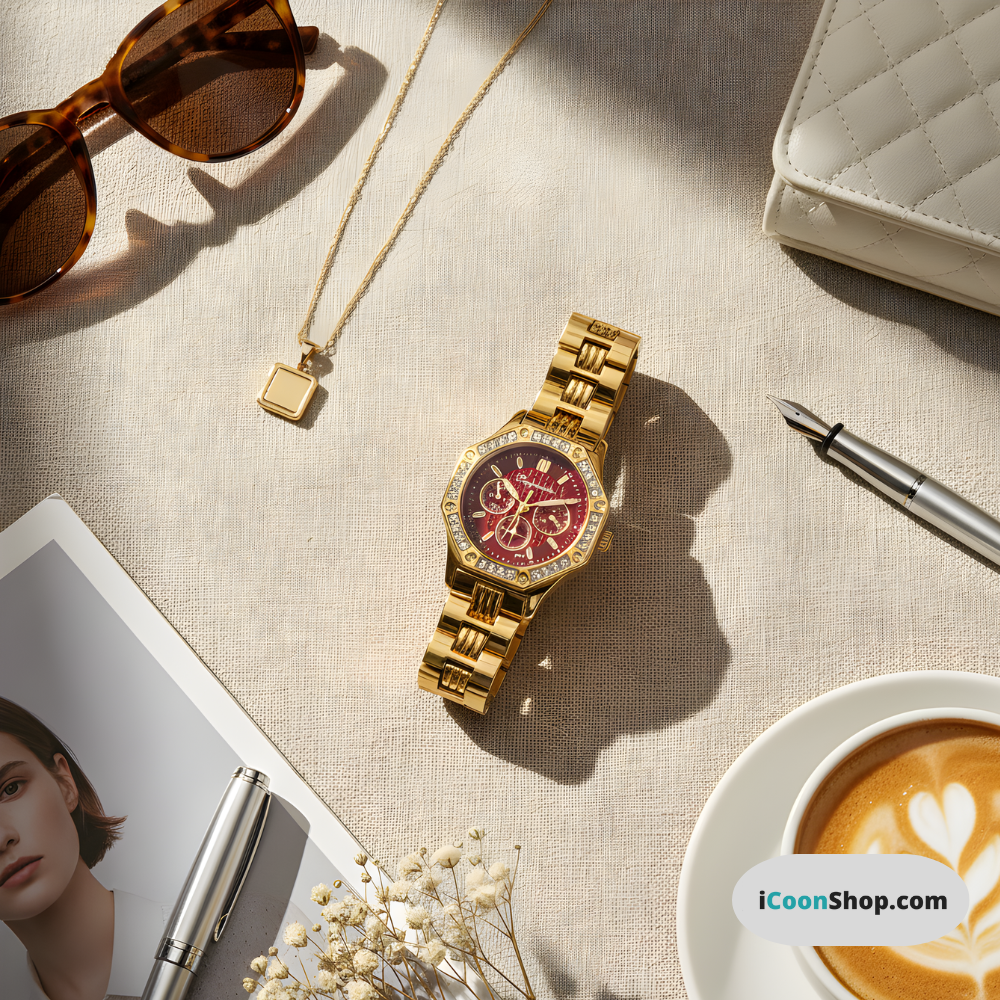 Ανακαλύψτε το Vintage Γυναικείο Ρολόι Sofia Gold Red, με χρυσό μπρασελέ και κόκκινο καντράν — η επιτομή της εκλεπτυσμένης κομψότητας από το iCoonShop.com. Αδιάβροχο (3ATM) και διακοσμημένο με λαμπερά στρας, προσδίδει λάμψη και γοητεία σε κάθε σας στιγμή.