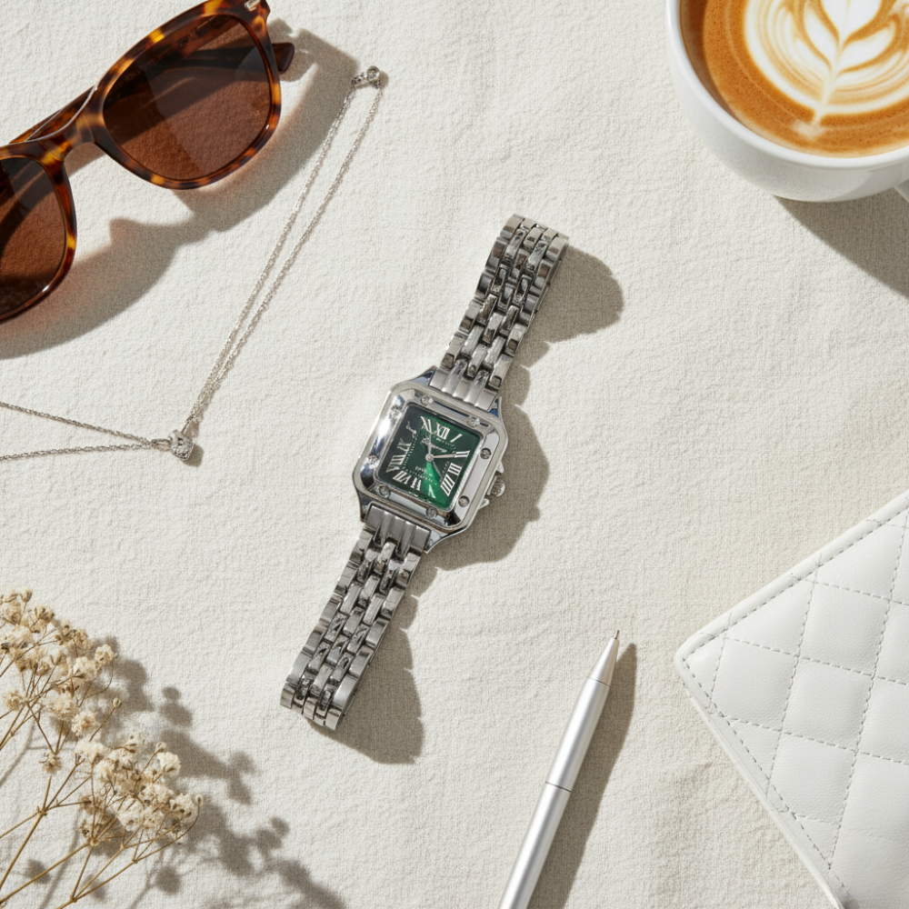Γυναικείο Vintage ρολόι με ασημί μπρασελέ από ανοξείδωτο ατσάλι και πράσινο τετράγωνο καντράν.
