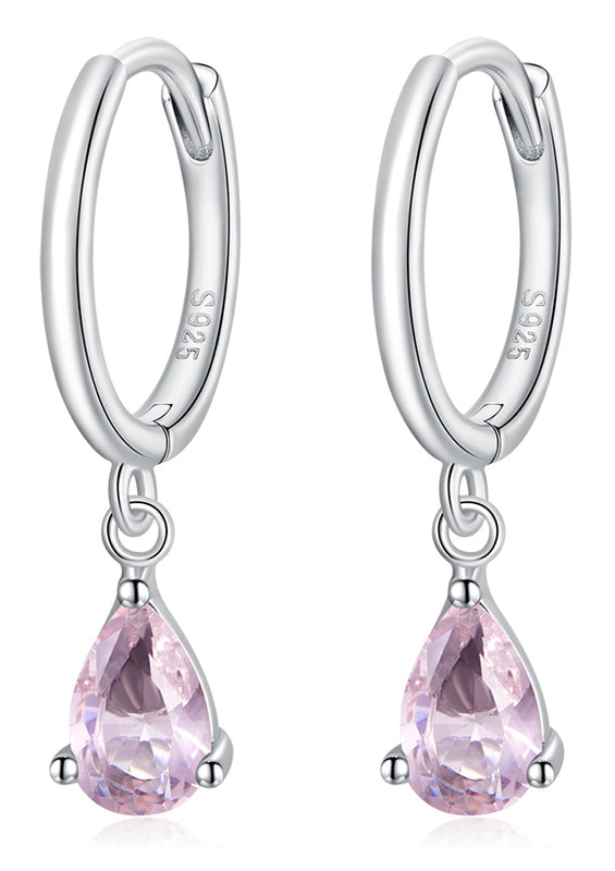 Σκουλαρίκια κρίκος Bamoer κατασκευασμένα από ασήμι 925, επιπλατινωμένα, διακοσμημένα με αστραφτερή κυβική ζιρκόνια σε σχήμα δάκρυ, ημιδιαφανούς ροζ χρώματος η οποία αντανακλά μοναδικά το φως και προσφέρει λάμψη στο κόσμημα.