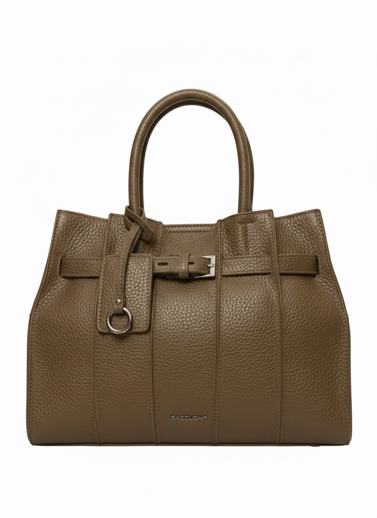 Τσάντα ώμου σε καφέ χακί χρώμα από υψηλής ποιότητας τεχνόδερμα. Αποτελείται από έναν κύριο χώρο που κλείνει με φερμουάρ.