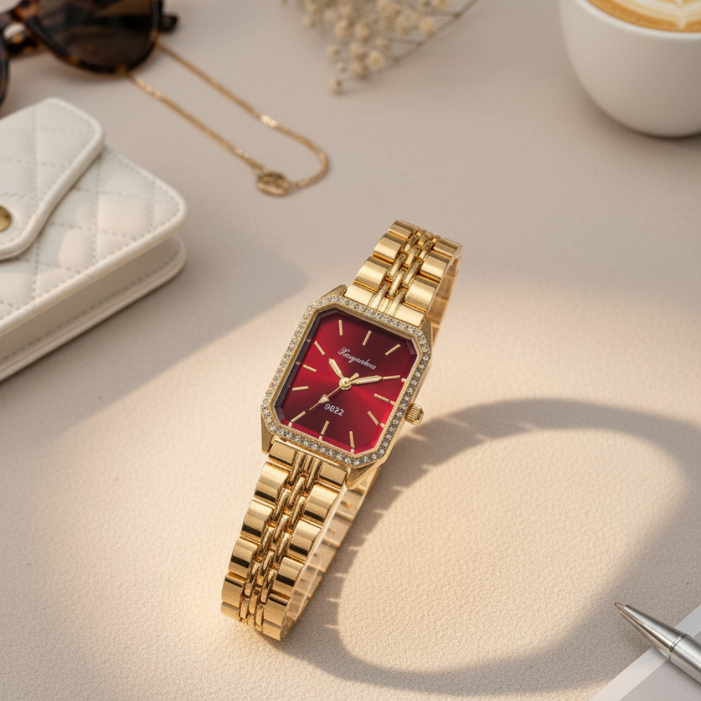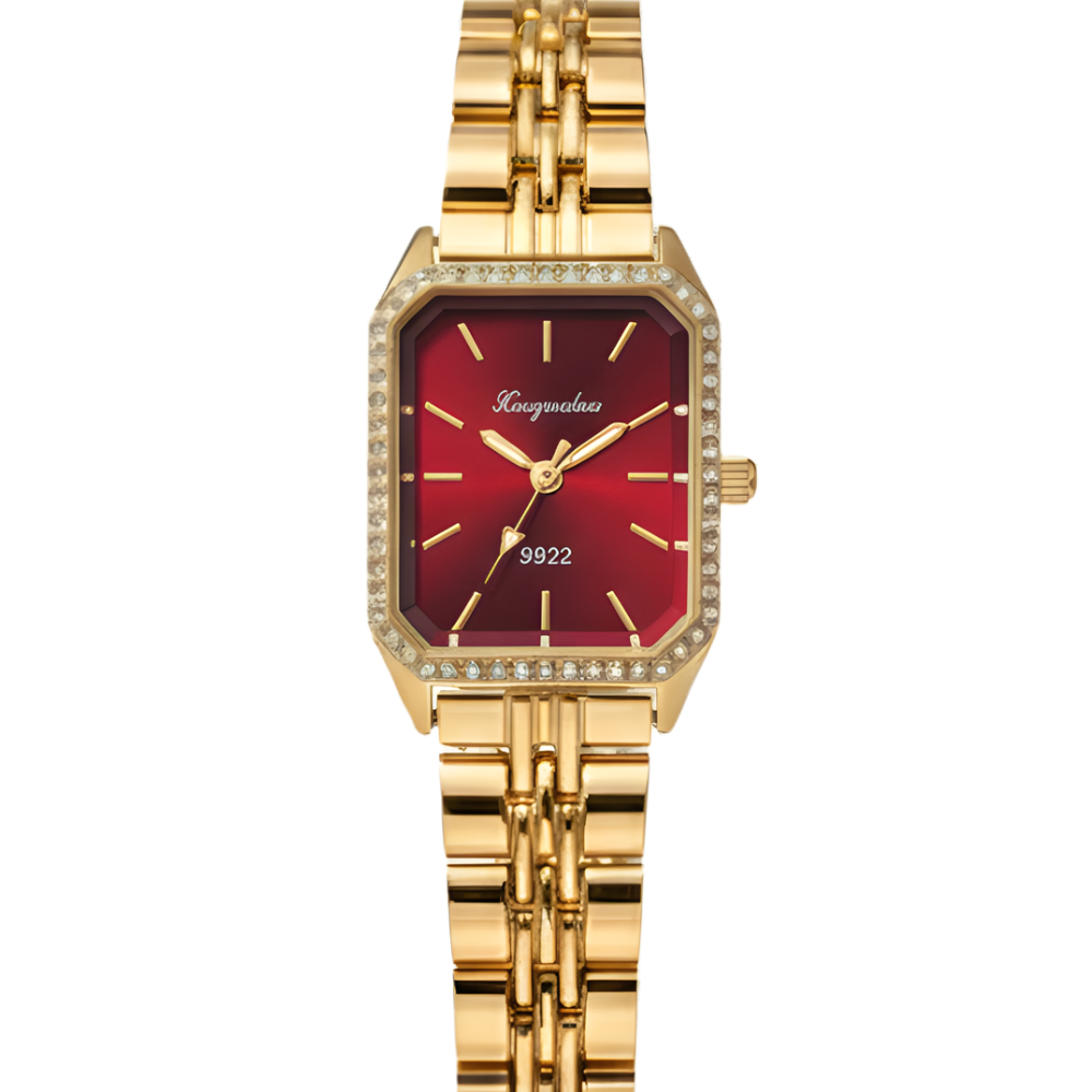 Γυναικείο Vintage ρολόι με χρυσό μπρασελέ από ανοξείδωτο ατσάλι και κόκκινο καντράν με στρας.