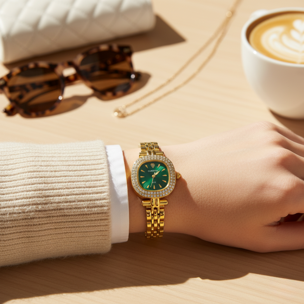 Γυναικείο Vintage ρολόι με μπρασελέ από ανοξείδωτο ατσάλι και πράσινο καντράν με στρας.